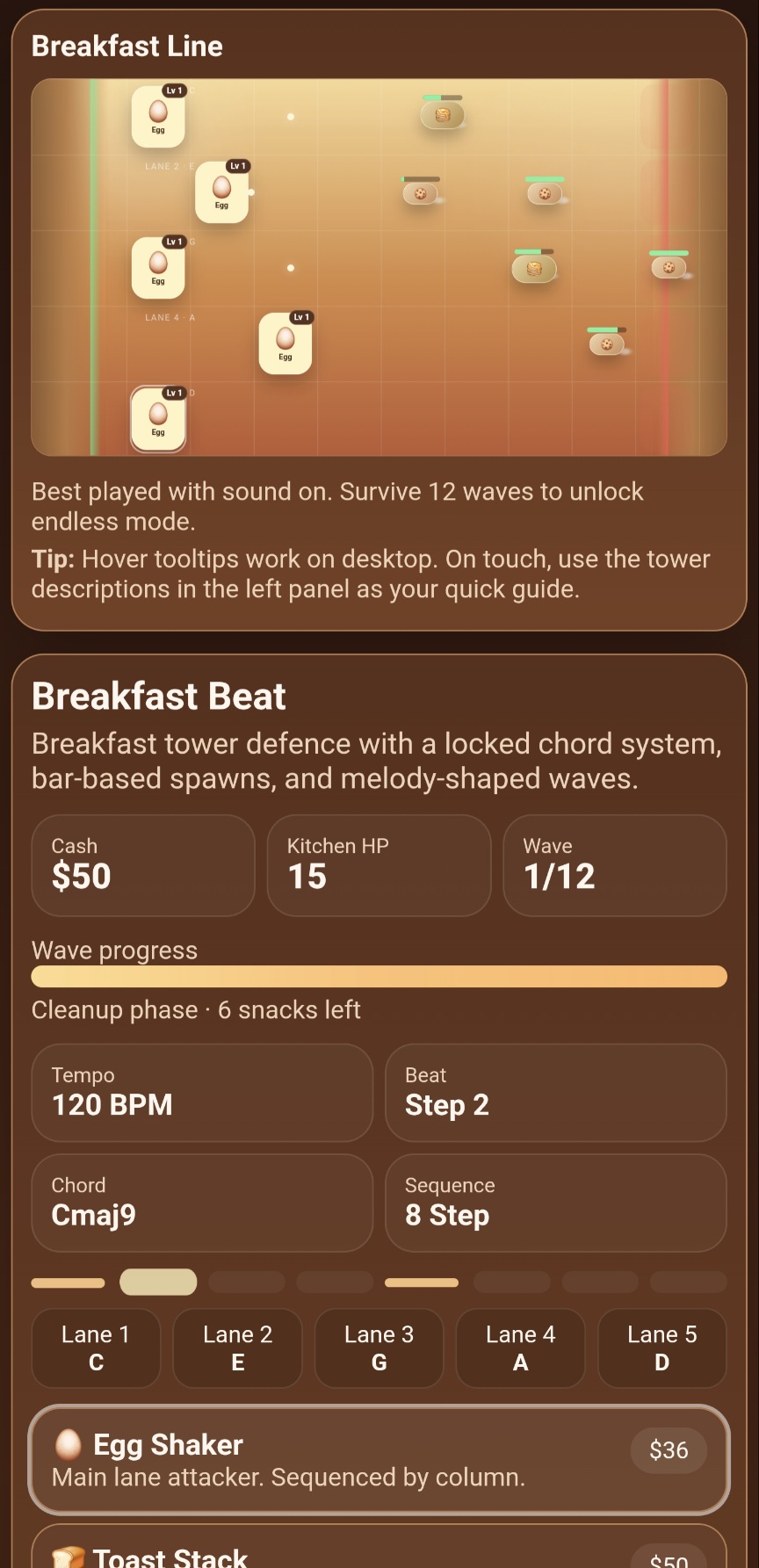 Place breakfast-themed defenses, hold back waves of incoming snacks, and build a groove while you play. Each lane is tuned to a note in a lush chord, and each column fires on its own step in the sequence, so the board becomes a playable musical grid as your setup grows.