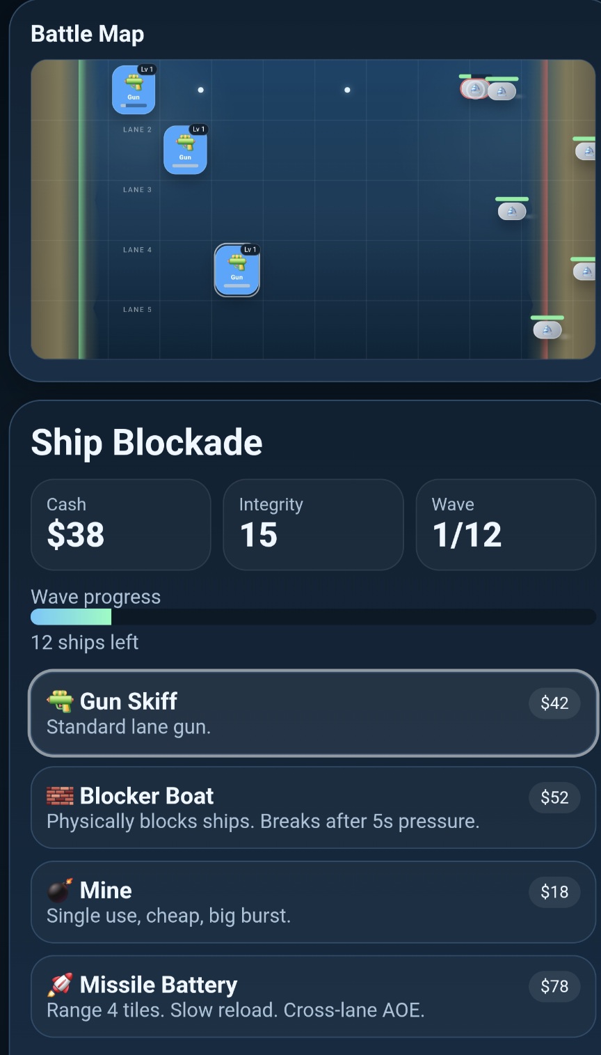 Ship Blockade is a fast, arcade-style tower defense game set in a narrow shipping lane.